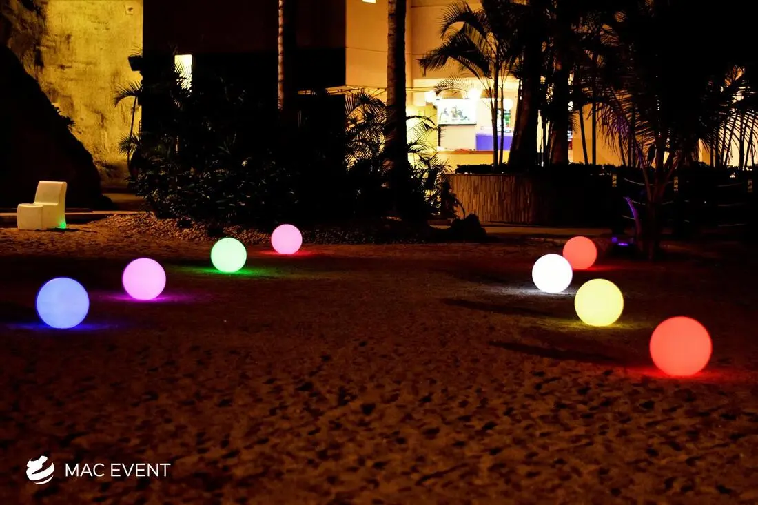 The orb lights add a modern and enchanting touch to weddings, parties, and corporate events in Mazatlan. With their spherical glow and elegant design, this event lighting rental creates a captivating atmosphere that enhances both indoor and outdoor spaces. Perfect for hanging above dining areas, floating in pools, or accenting garden setups, orb lights bring sophistication and creativity to your décor. Renting orb lights in Mazatlan ensures professional installation, high-quality lighting, and seamless integration with your event theme. For a stylish and magical ambiance that impresses guests, the orb lights are a perfect choice.